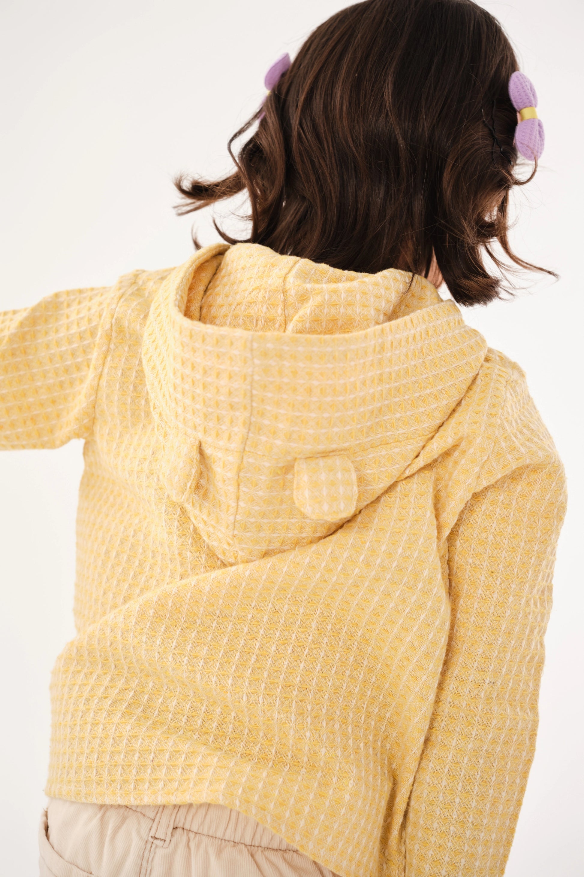 This fun bear waffle hoodie is sure to make your little cub look even cute. Layered double breasted front adorned with coconut buttons and a secured zipper underneath for easy changes. This hoodie is designed specifically for extra comfort and sufficient room during playful time. Cute bear ears on the hood makes your little one look super cute and steal the show wherever they go.