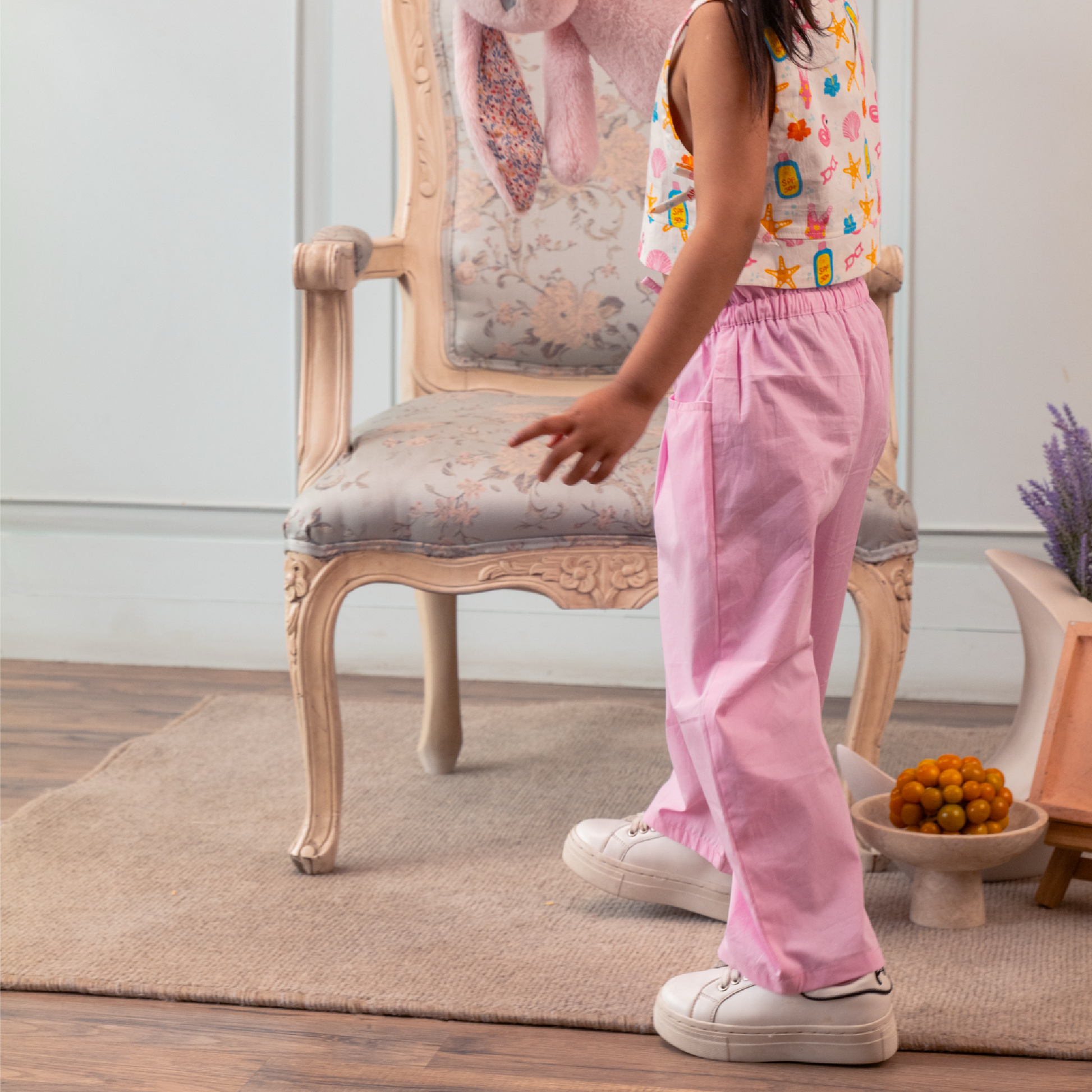 The matching trousers have a soft, ruffled waistband with a drawstring for extra comfort, roomy wide legs for easy movement, and handy pockets for stashing little treasures. It’s the perfect outfit for warm weather wanderings and beachside twirls.
