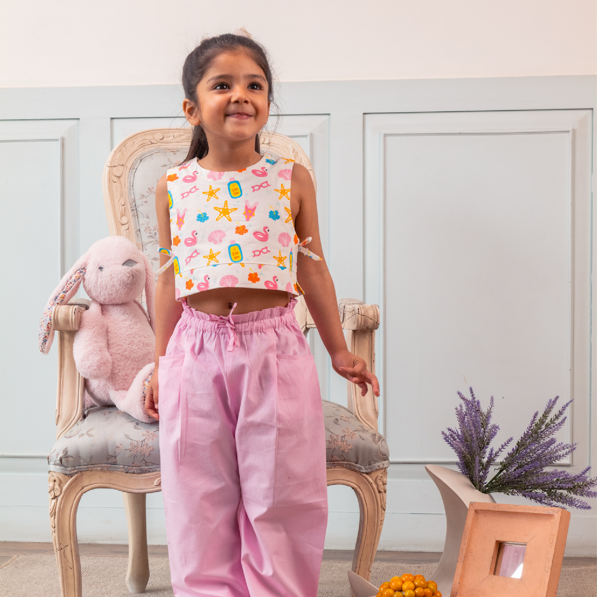 Sunshine, smiles, and the cutest beach vibes! Our Summer Daze Set is made for summer fun, featuring a sweet printed crop top in our signature Beach Peach Print and breezy wide-leg trousers. The top is full of charm with a playful beach print — think flamingo swim tubes, SPF bottles, swimsuits, and tropical flowers — and a tiny bow detail at the sides for an extra pop of cute and natural flower shaped coconut buttons down the back for an extra special touch.