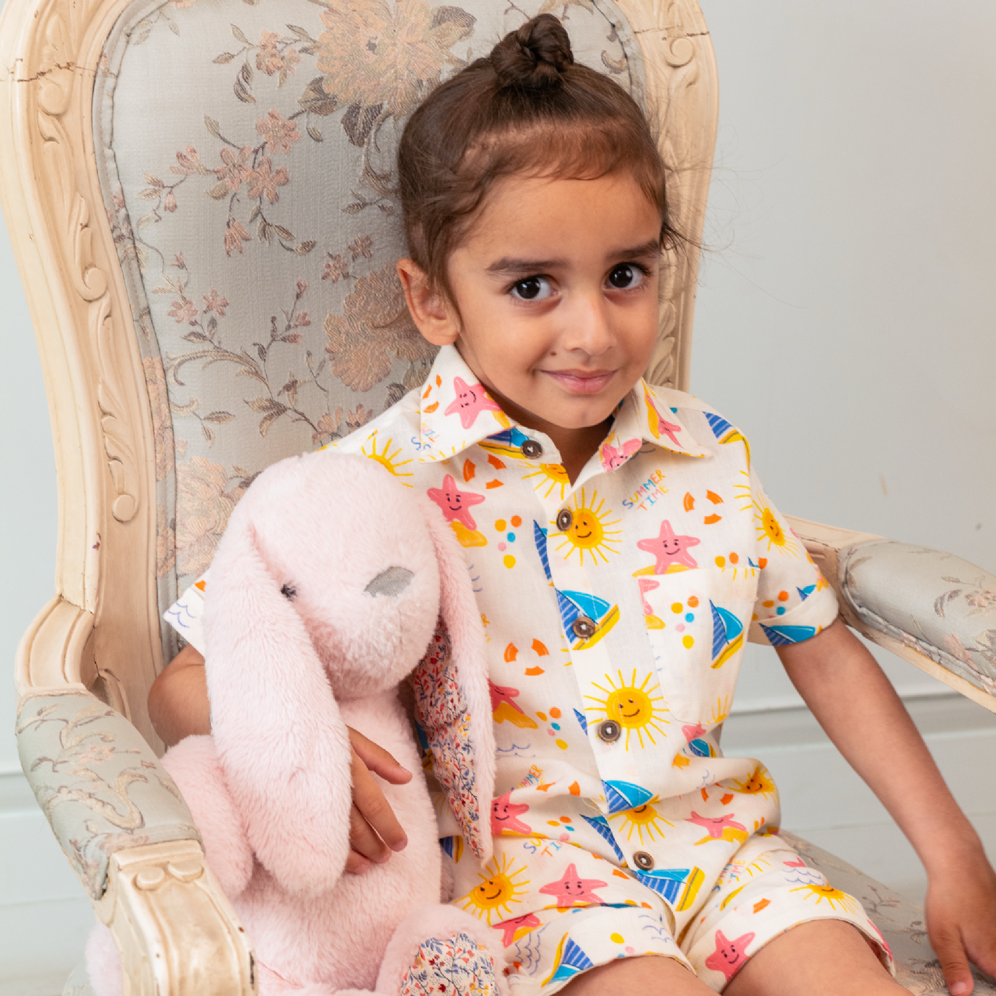 Bring on the sunshine with our Summer Time Shirt & Shorts Set — made from lightweight, breathable organic linen for the coolest little beach explorer. Covered in a joyful all-over print of boats, smiley suns, floaty tubes, waves, and “summer time” text, it’s the perfect outfit for fun-filled days by the sea or in the garden.